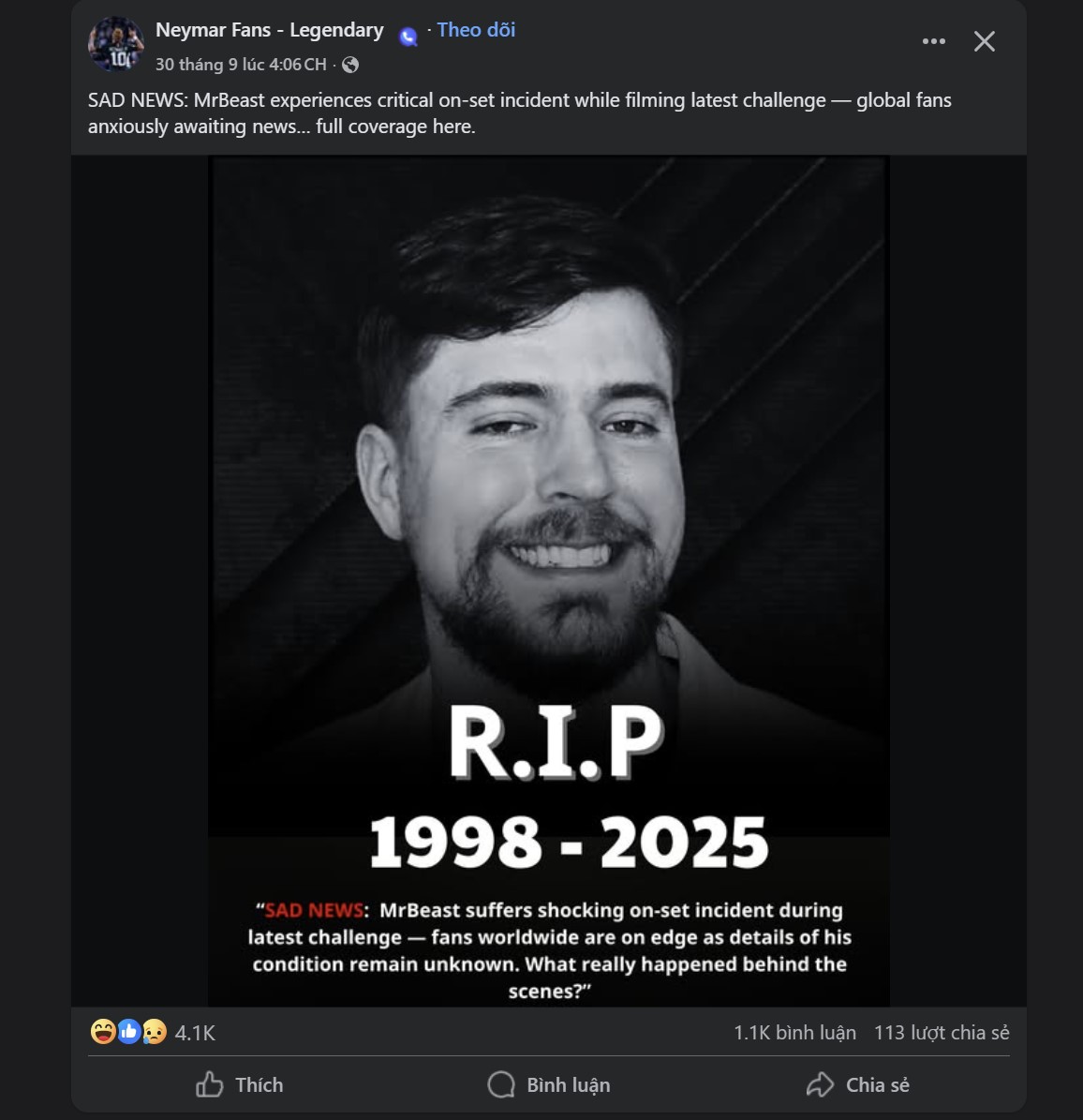 Một số bài đăng, bao gồm cả hình ảnh được chỉnh sửa với dòng chữ "R.I.P 1998 - 2025" và tiêu đề giật gân về một "sự cố nghiêm trọng" trong quá trình quay thử thách mới, đã khiến nhiều người tin rằng thần tượng của họ đã qua đời.